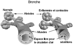 L'asthme est une réaction des bronches qui entraine de l'inflammation. L'inflammation fait augmenter la production de sécrétions, qui s'accumulent dans les bronches. De plus, les muscles entourant les bronches sont plus sensibles chez les personnes asthmatiques. Lorsque l'inflammation s'installe, ils peuvent réagir en se contractant davantage. C'est ce qu'on appelle la bronchoconstriction.